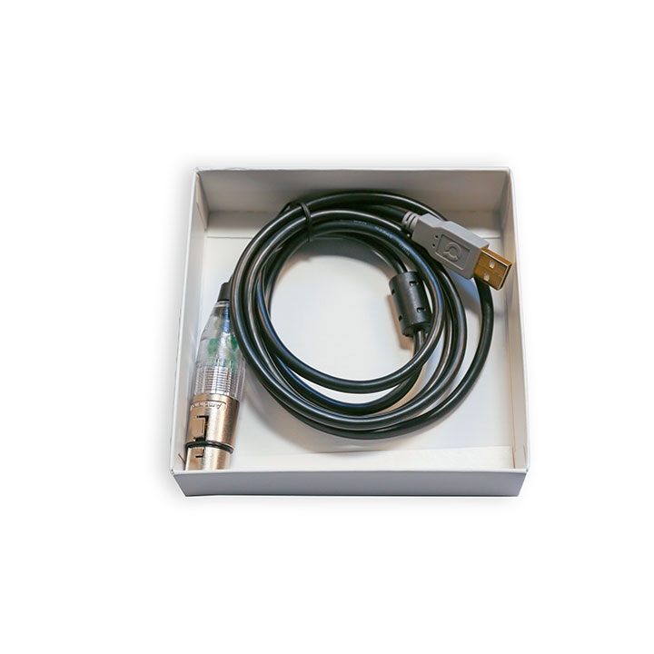 The UD512 is a simple 1.5m cable connector that gives you 512 DMX channels*. The UD512 is powered from the USB port and has two LED indicators showing if the input is selected and DMX activity.